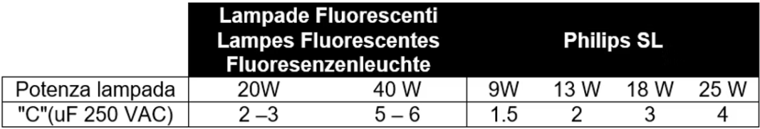 NB: Per un carico induttivo diverso, quale ad esempio motori, ventilatori, piccoli elettrodomestici, ecc, vogliate contattarci per richiedere il valore della capacità necessaria.